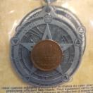 世界を構成する五大元素や我々人間を象徴する魔術的シンボルである五芒星を中心にした魔除けのタリスマン。五芒星の頭上には魔術師ソロモン王の印章として知られる六芒星、そして左右上下には四大元素のシンボルが風(AER)、火(IGNIS)、水(AQUQ)、地(TERRA)というラテン語とともに記され、加えて宇宙を満たす第五番目の元素とされるサンスクリット語のアーカーシャ(AKASHA)の文字が記されています。背面には五芒星と同じく「五」の数字に由来するハムサ(蛇眼除けとして用いられるユダヤのシンボル)を中心に同様に五大元素が配置されています。