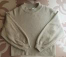 たぷんとしたボリューム袖がポイントのニットはショート丈なので、トレンドのゆるボトムと好相性。