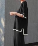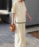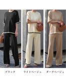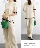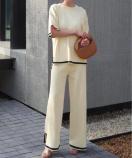 縁に配色のラインを施しているのがアクセントになっているニットセットアップです