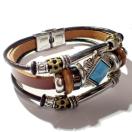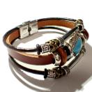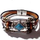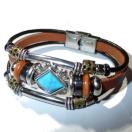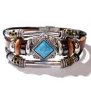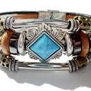 菱形のターコイズブルー色の石に、銀色やブロンズ色の装飾された金具の付いたカッコいいブレスレットです。
