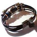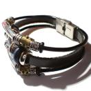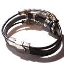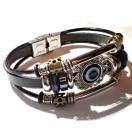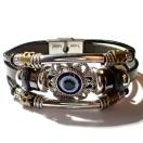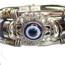 青色の目の玉に、銀色やブロンズ色の装飾された金具の付いたカッコいいブレスレットです。