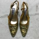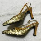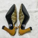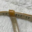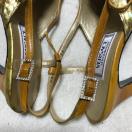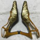 ゴールドのスパンコールのようなデザインで、トリミングやストラップはライトブラウンのエナメルです。