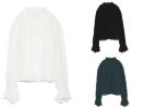 程よいスタンドネック、袖口にあしらったギャザーが女性らしさを引き出します。