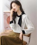 滑らかな生地で触り心地も良く、ポイントのボウタイと袖口のバイカラー配色が洗練された雰囲気を演出します