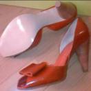 茶エナメルのリボンパンプス、ヒールは円柱状で珍しい形で高めですが、とても履きやすいです。