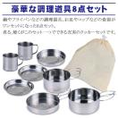 商品説明キャンピング鍋 食器 クッカー 8点組 ステンレス製 重ねて収納 アウトドア 調理道具 フライパン/鍋/皿/マグカップ 携帯袋付 ◇ キャンピング鍋・食器 8点セット