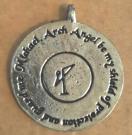 この1 1/2インチ直径のピューターのお守りの前面には、天使文字でマイケルの名前があり、彼に帰せられる印章です。裏面には「天使よ、天使よ、私の守りの盾となって私を守ってください。」と書かれています。