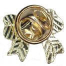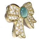 金属製の金色に、中央に薄いグリーン系の石と、透明なラインストーンが散りばれられた可愛いバッジです。