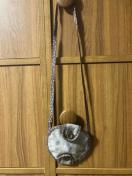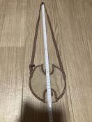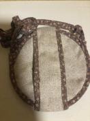 布製でショルダーとパイピングと内側が茶系小花柄です。紐は縫われていて取れませんが、まとめて結べは掛けずにベルトに通す使い方も出来ます。