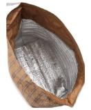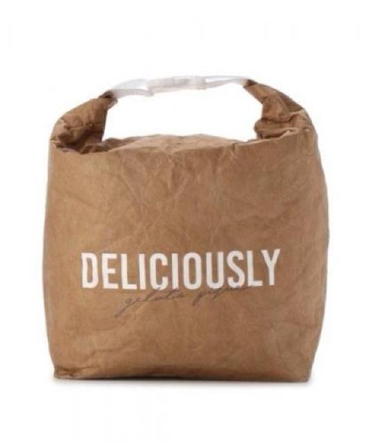 ”DELICIOUSLY”と書かれた、デリ風ランチバッグ。裏地は保冷シートになっており、夏場も安心してお使いいただけます。また、くるくると丸めてストラップを止めるとワンハンドルになり、持ち運びもすっきり。