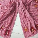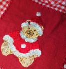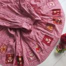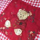 パッチワークのベースは無地、チェック、1mmギンガム、3mmギンガム、小花、チューリップと小花、ダッフルくまちゃんのコートは赤、オレンジ、深紅の種類があり、総刺繍のパッチワーク24枚の大変凝った圧巻スカート装苑掲載伝説の作品