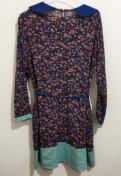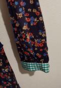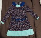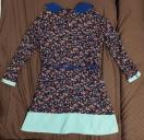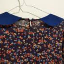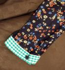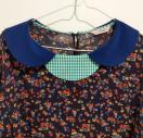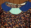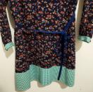 紺地に赤などの小花プリントに裾と襟と袖口の緑のギンガムチェックの切り替えが、楽しいワンピース