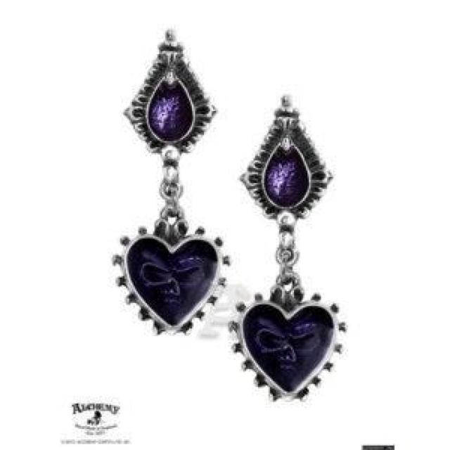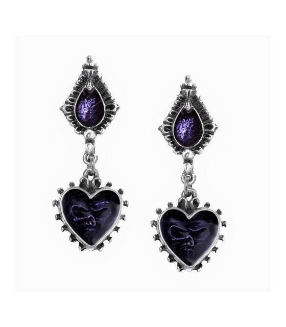 魂の鏡 MIRROR OF THE SOUL、ゴシックなハート型のイヤリングです。この特別なアクセサリーを身につけると、奥深い魂の世界を覗き込むことができます。魂の鏡 MIRROR OF THE SOULは、イングリッシュピューター素材で作られ、プレシャスなエナメル石で飾られています。バイオレットのシェードが、このイヤリングに神秘的な雰囲気を与えます。