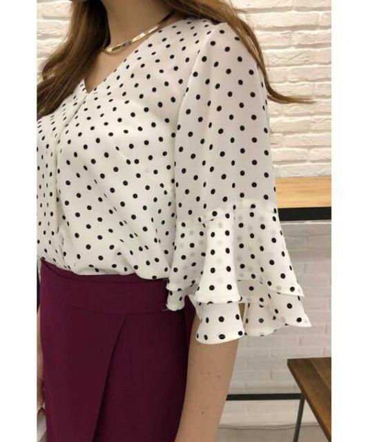 トレンドのドットプリントが目を引く、エアリーで優しい肌触りのシフォン素材で作られたブラウスです。フロントVネックに1タック入ってニュアンスのあるふわりとしたシルエット。2枚重ねになったフレアースリーブがエレガントなポイントに。締切日時