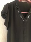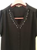 ひらひらとしたフリルスリーブがフェミニンなブラウスです。ラグジュアリーなアクセントを添える、ネックラインを飾るビジューモチーフも◎。