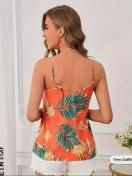 リーフプリントVネックキャミソールトップス、バケーションスタイルノースリーブキャミソールトップス、春夏用レディースウェア