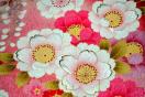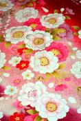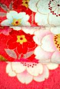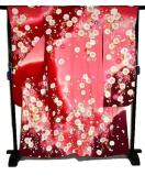 ・生地の真紅とピンクに映える枝垂れ桜が人目を惹き、