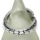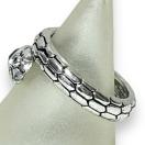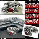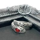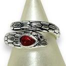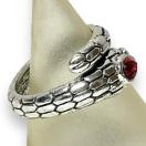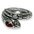 ティアドロップ形の真っ赤なストーンが頬に付いた横向きの蛇が指に巻き付いたデザインのフリーリング