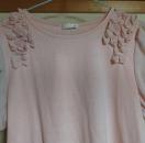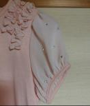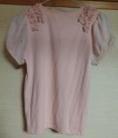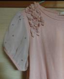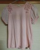 ピンクのオーガンジーリボンのフリルが肩のあたりに付いたTシャツ