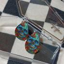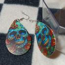 合皮素材に発色の良いスカルとバラのプリントされた大ぶりなフックピアスです。軽くてインパクトがあります。