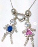 中央にハート、女の子&男の子のモチーフトップが可愛いシルバーネックレスです。男の子にはブルーストーン、女の子にはピンクのストーンが入っています。シルバー製で女の子に925刻印があります。(チェーンとトップは取り外しできません。)チェーンはつまんで取り外し、つまんで差し込むタイプです。チェーンにブランド名らしき刻印がありますが、わかりません。