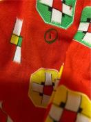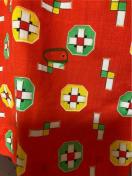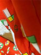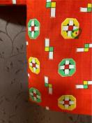 朱色に緑と黄色の柄で、しつけ糸と洗濯タグが付いているので市販のものだったようです。