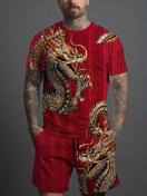 メンズノベルティドラゴンデジタルプリントアウトフィットセット、メンズショートスリーブTシャツ&ポケット付きドローストリングショーツセット、夏のストリート用