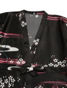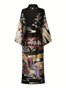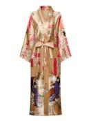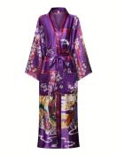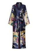 フローラルプリントナイトローブ、ベルト付きロングスリーブVネックローブ、女性用ナイトウェア