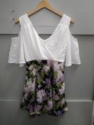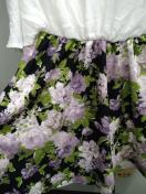 上はシフォン地で肘くらいの袖丈、下は黒地にパープルやグリーンの花柄です!