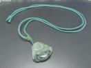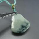 ●この翡翠の彫刻ペンダントは、ミャンマー産の天然ひすい(ジェダイト)で作られています。布袋様の形をした彫刻は、縁起の良い開運アイテムとして人気があります。天然石ならではの独特な模様が入っています。ペンダントトップは天然素材のため、一つ一つ模様の入り方が異なります。ペンダントは水色の紐に通されており、首に掛けて身に付けることができます。
