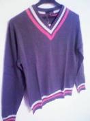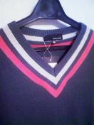 落ち着いた雰囲気のVネックセーターネックと袖のピンクのラインがアクセントカラーでキレイにまとまります伸縮性があり、気心地良いですよ