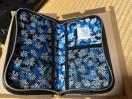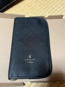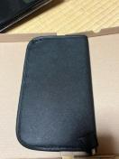 マルチケースは黒のレザー調素材にブランドの箔押しがされていて、内側は花柄、左右にメッシュポケットが付いています。
