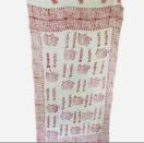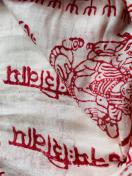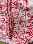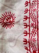 赤色の模様が施された白い生地で、視覚的に魅力的です。太陽や神聖なシンボルが描かれており、インテリアに特別な雰囲気を加えます。