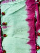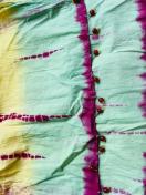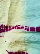 このストールは、黄緑と赤紫の美しいグラデーションが特徴で、目を引くデザインです。タイダイ染めの技法が施されており、個々のアイテムに独自の風合いがあります。