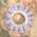 ふわふわした毛糸で編んだ、かぎ針編みのフリフリ編みシュシュです。