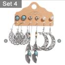 セットには6個の異なるデザインのイヤリングが含まれており、シルバーとターコイズの色合いが美しく、様々なコーディネートに対応できます。羽根や月のデザインが特に目を引きます。