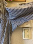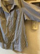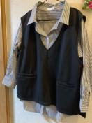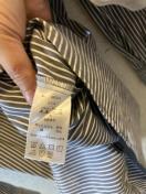 黒白ストライプで、ダーツが細見えするスタイルの、お尻が隠れるチュニック丈のシャツです。
