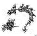 未知の力を秘めたトアドラゴンの頭と尻尾が耳元で蠢く。幻獣のパワーを身に纏い、他を圧倒する存在感を演出します。サージカルスチール製のイヤーポストを装備した8mmメタルホーンフェイクストレッチャー ピアスは、耳に装着するだけでドラゴンの力を宿すことができます。