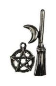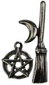 三日月魔女のほうきと小さな五芒星が描かれたピューターのお守りペア。両方のチャームが付属しています。AAWWITB