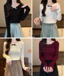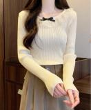長袖無地ニットソー/大人可愛いトップス/タイトトップス秋冬