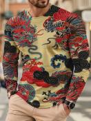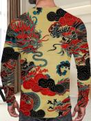 メンズ バイブラント ドラゴン&クラウド プリント 長袖Tシャツ - カジュアル ポリエステル ニット、洗濯機可、ラウンドネック - 春/秋にぴったり、中国風パターン