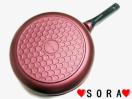 底面全体に広がったハニカム状の溝が食材自体の油や水分をまんべんなく広がらせ六角形の中央の独立した窪みが油を確実に留まらせる事で食材をよりこびり付きにくくします
