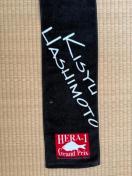 黒色のタオル素材に、白色の文字で「Kisyu Hashimoto」と記載されており、赤色のロゴが印象的です。多くの名前がデザインに含まれており、特別感を演出しています。