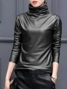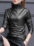 【人気の選択】エレガントな女性用長袖PUレザースウェットシャツ、スタンドカラー、無地、ハイストレッチ生地 - オールシーズン対応