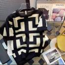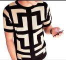 幾何学ラインデザイン半袖サマーニットTシャツ ? ブラック&オフホワイト