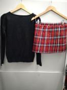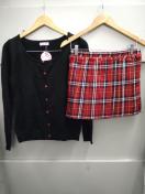 ブラックの長袖ニットカーディガンと赤のプリーツスカートです!