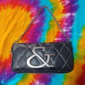銀糸入り、オフショルダーとパフスリーブのデザインが特徴の黒いニットトップス。