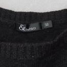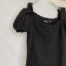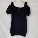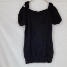 銀糸入り、オフショルダーとパフスリーブのデザインが特徴の黒いニットトップス。