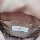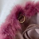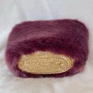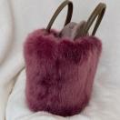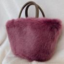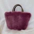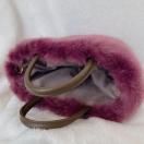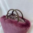 パープルのファー素材を使用した小型ハンドバッグ、巾着式デザイン。