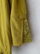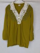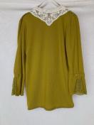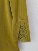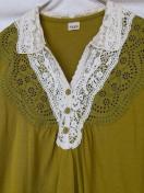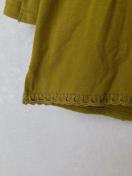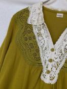 明るめのオリーブグリーンのレース付きVネック五分袖トップス。